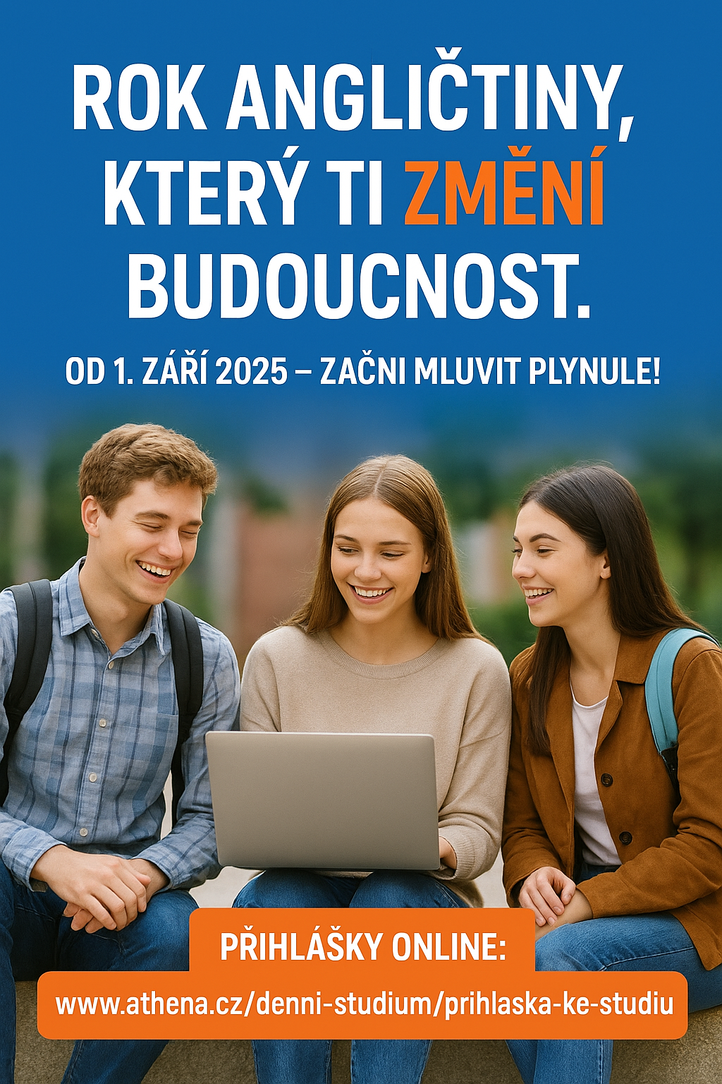 Ředitel Jazykové školy ATHENA vyhlásil 1. kolo přijímacího řízení do Jednoletého denního jazykového studia (pomaturitního studia) – jazyk anglický na školní rok 2025/26.