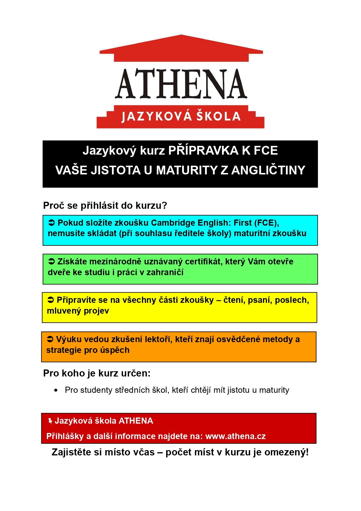 Bližší informace o jazykových kurzech můžete získat na www.athena.cz nebo na telefonu 774 770 365, 774 408 416 nebo pište na mail: kancelar@athena.cz